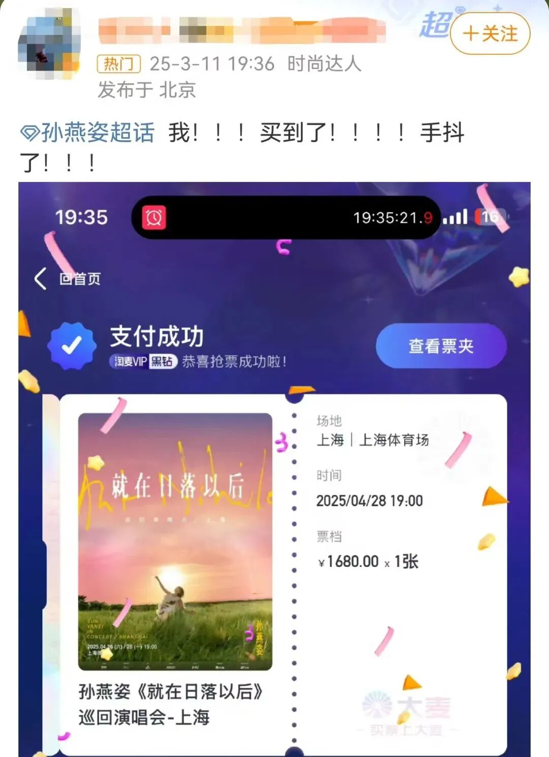 3月11日晚,孙燕姿《就在日落以后》巡回演唱会上海站开票,结果几秒钟的时间,上海站两场演唱会的门票便售罄。“秒没,太快了”“几乎一眨眼就没了”……很多抢票的网友纷纷表示。